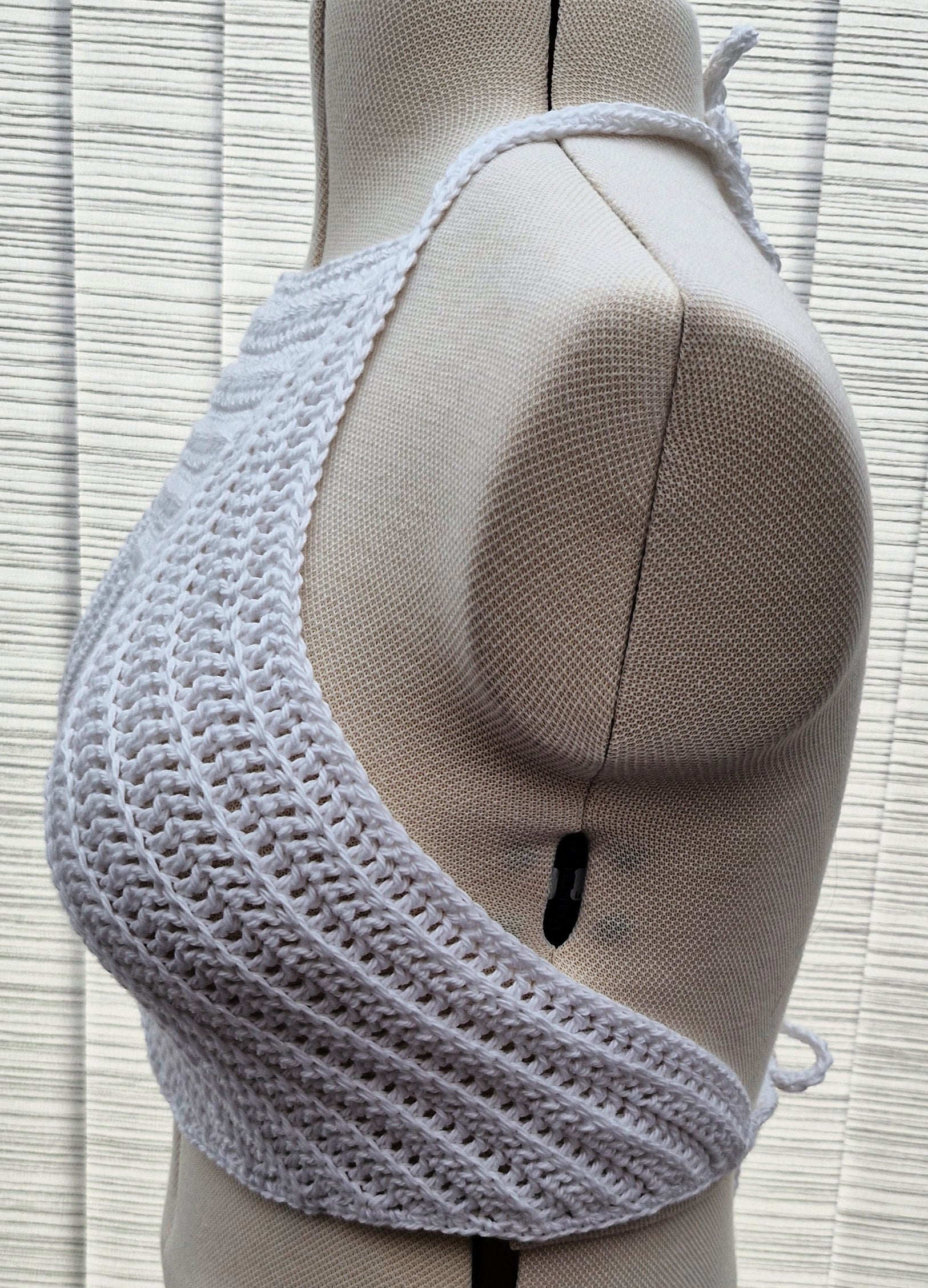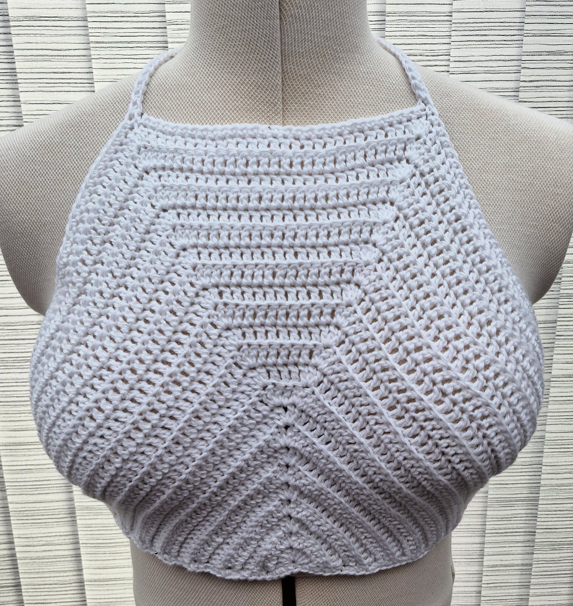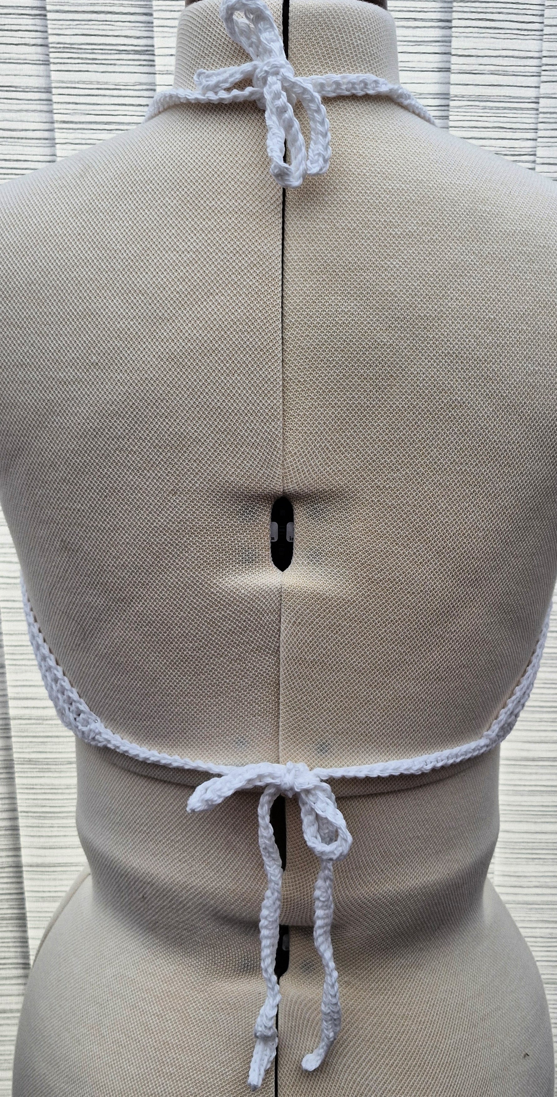 Brand new Womens Handmade Crochet Cropped Top in White. Top is Halter Neck and fastens around the back neck and at the bottom around ribcage. Made from 100% Cotton.