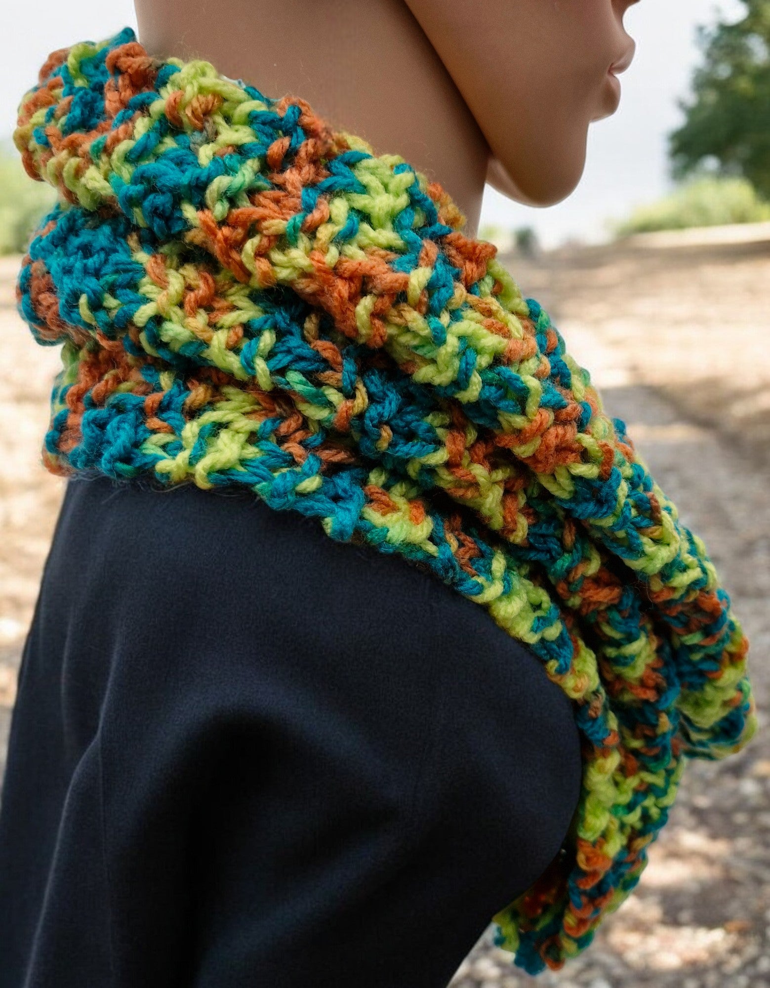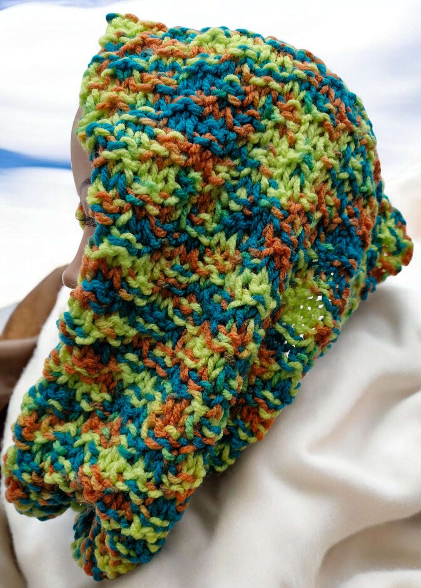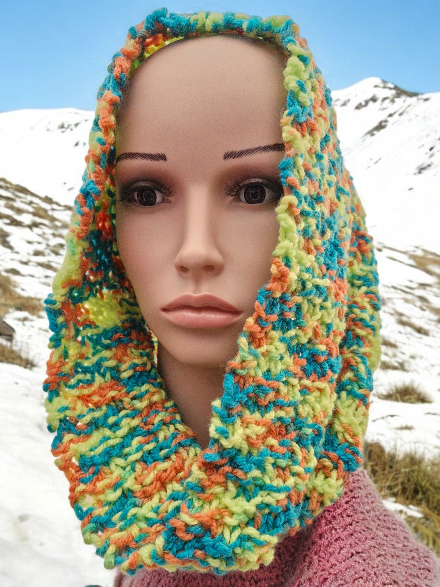 Brand new Women's Hand Knitted Moss Stitch Cowl in Yellow, Orange and Teal (Dark Turquoise). Cowl is knitted in Moss Stitch pattern and pulls on over the head. It can be worn either just around the neck or over the head and neck to keep your ears warm - more practical than a scarf. Yarn is medium weight DK yarn. Made from 100% Acrylic - cool machine wash.