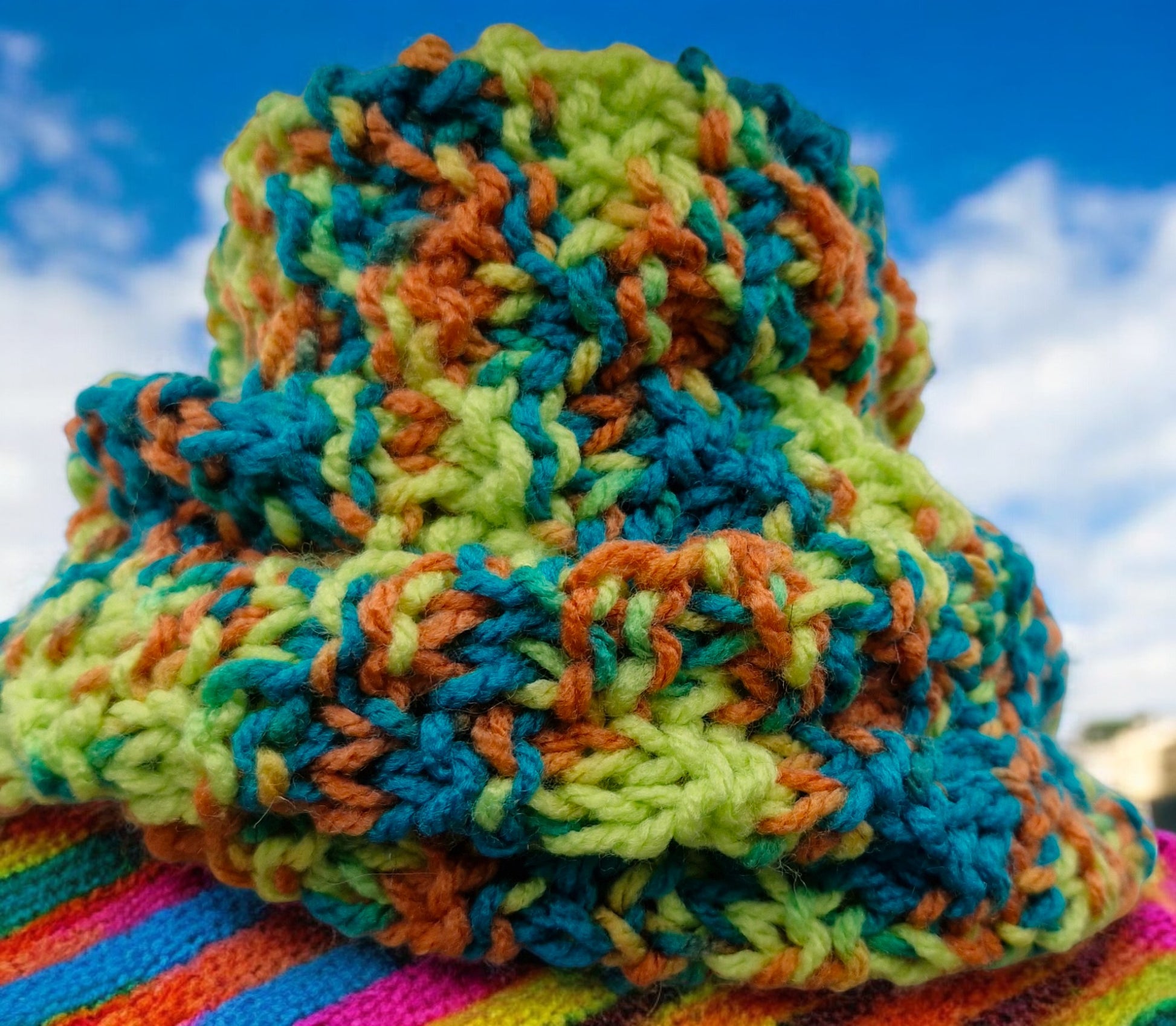 Women's Handmade Knitted DK Yellow Orange and Teal Cowl in Moss Stitch