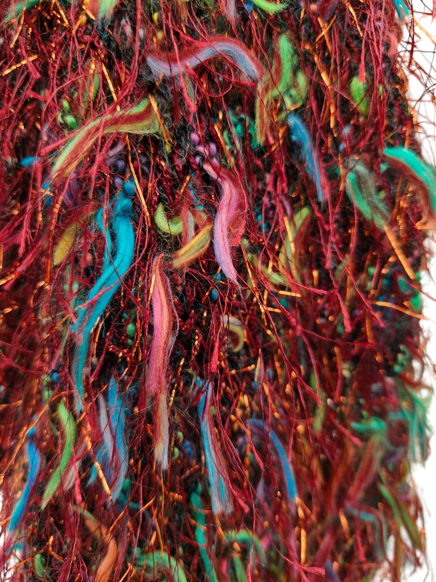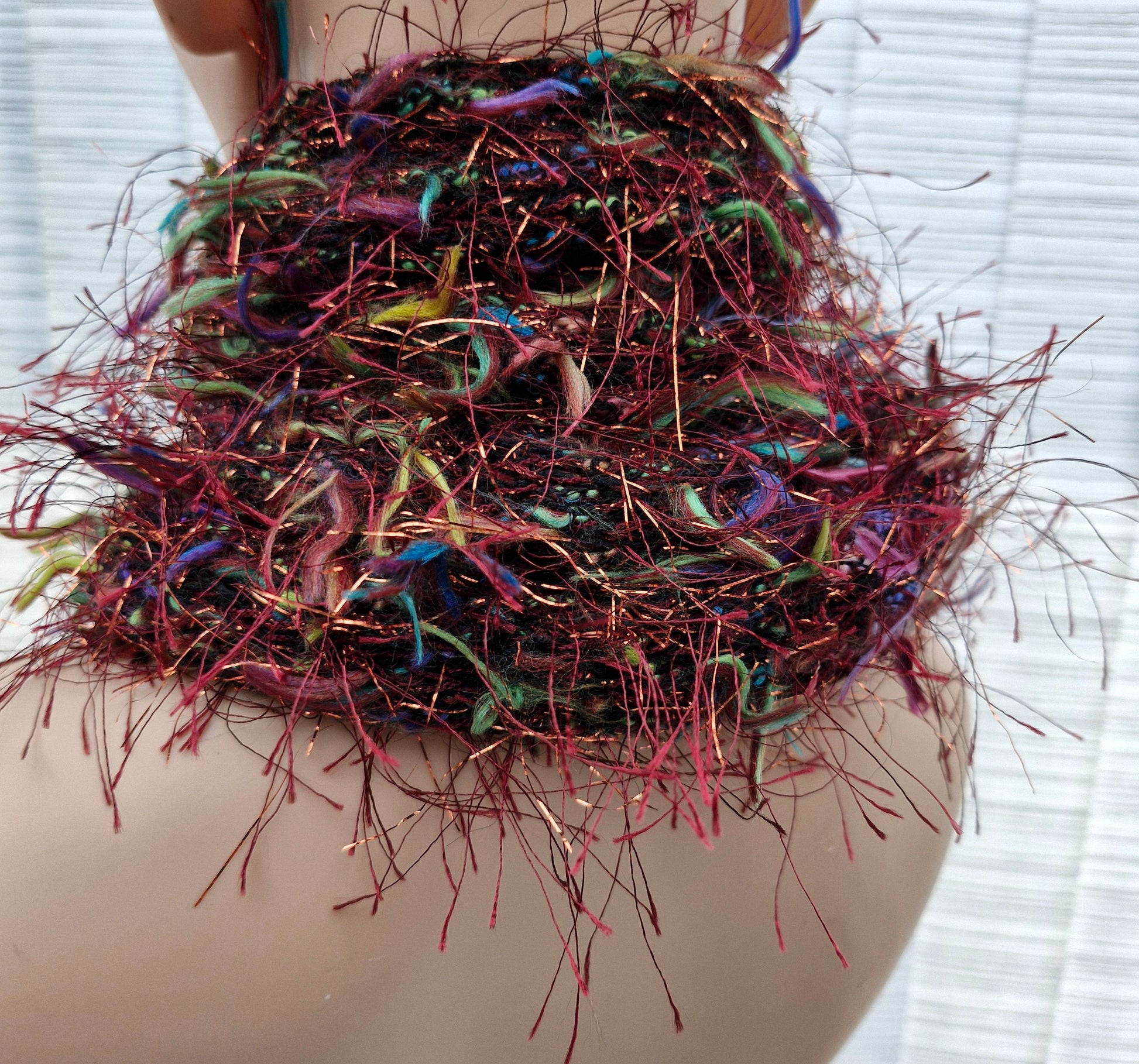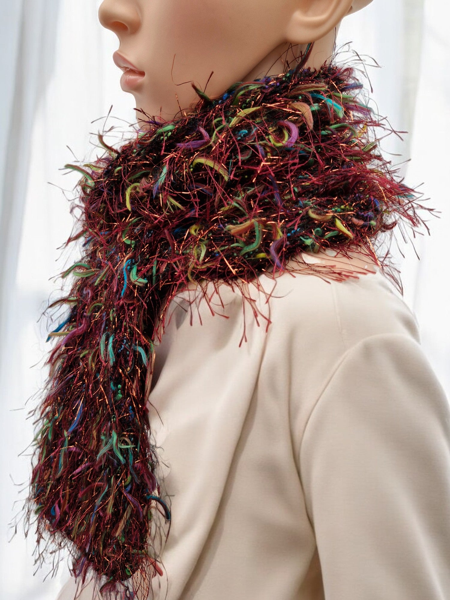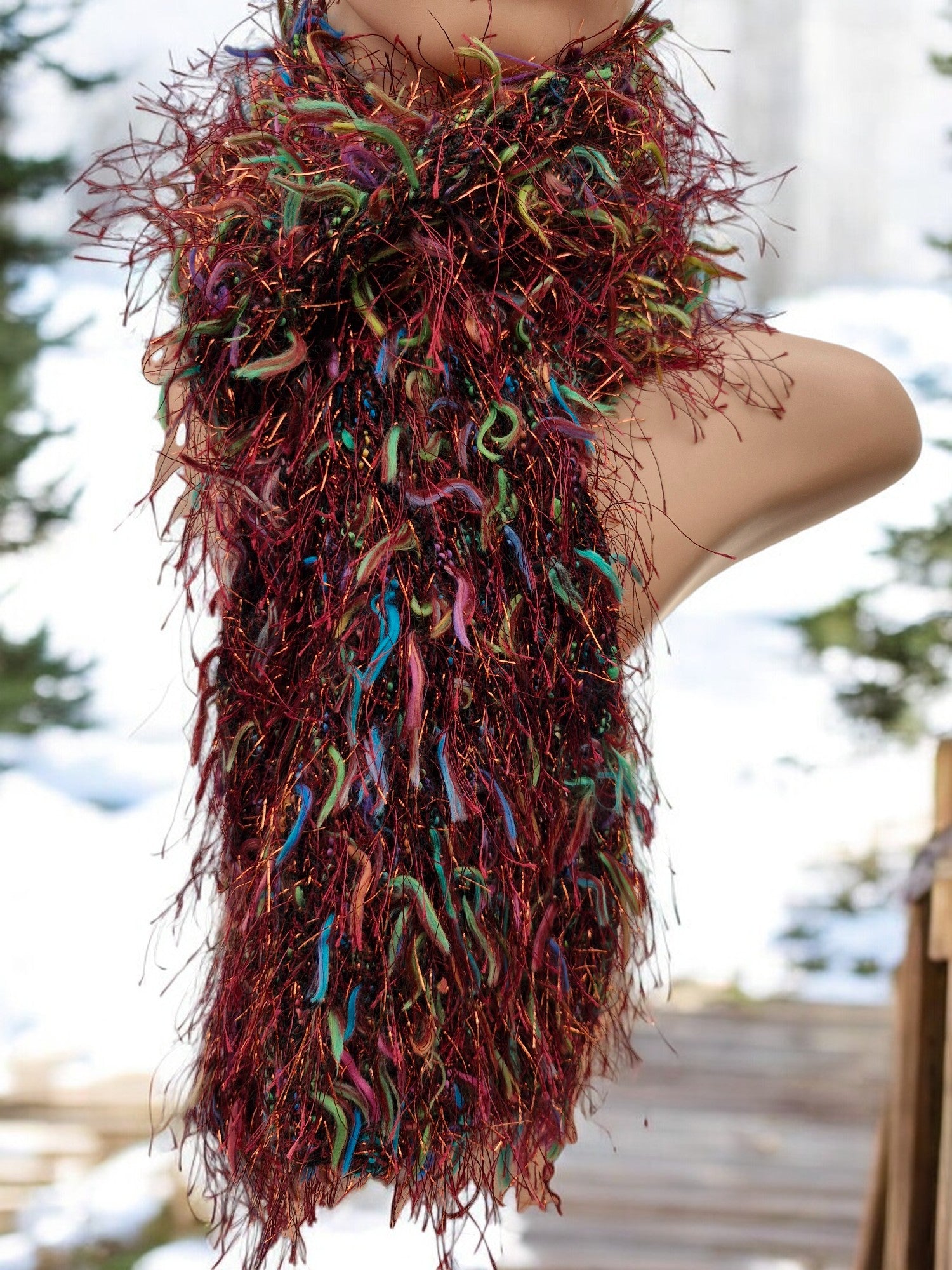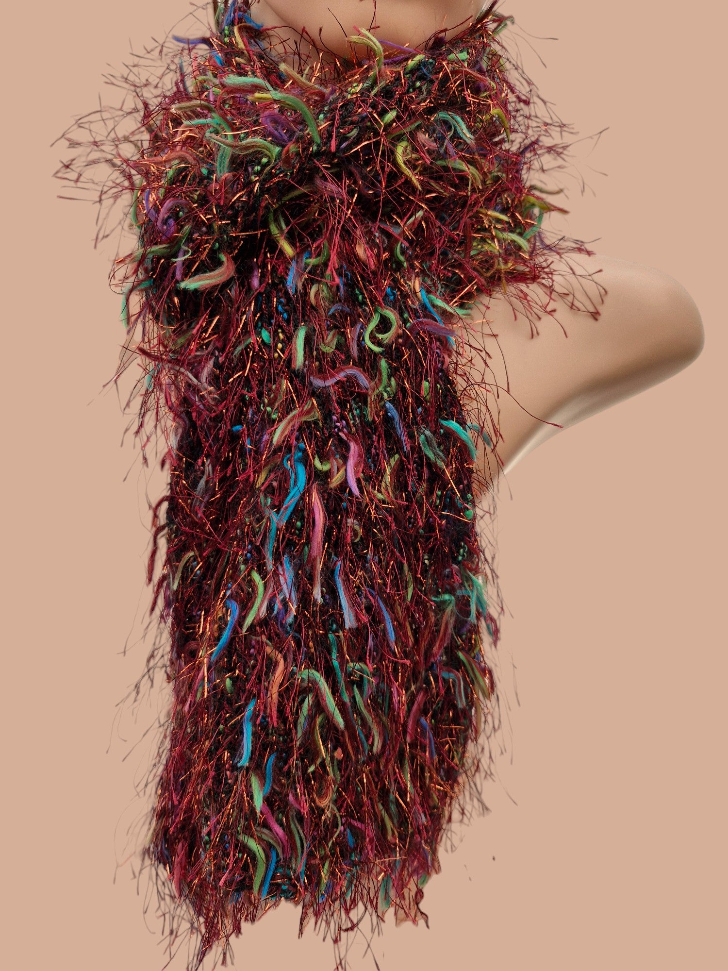 Brand new Adult's Hand Knitted Stocking Stitch Scarf in Brown with multi colour flecks. Yarn is Brown fluffy yarn with long hair-like tufts of Turquoise, Lime Green, Pink and Yellow plus Brown glitter hairs- DK weight. Scarf is fun, unique and dresses up an ordinary outfit - elegant and dressy. Made from 80% acrylic,10% Polyamide, 10% Nylon - cool machine wash.